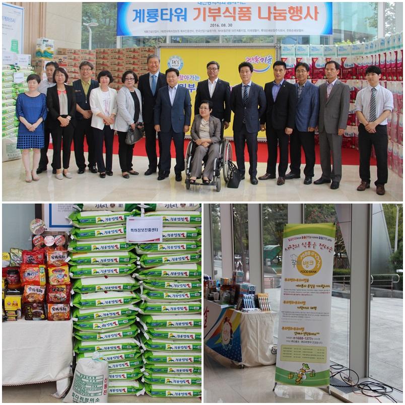 특허정보진흥센터는 지난 8.30.(화) 대전시에서 주최하는 기부식품 나눔의 날 행사에 계룡타워 입주사들과 함께 참여하여 직원들의 정성으로 마련된 기부물품을 전달하였습니다. 앞으로도 지속적인 사회공헌 활동을 통해 지역사회와 함께 상생하는 공공기관이 되도록 노력하겠습니다.