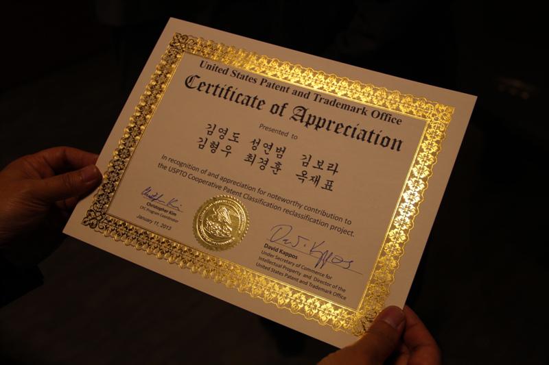 미국 특허상표청(USPTO)은 지난 1, 2차 미국 특허 재분류 사업의 성공적 수행에 감사하는 뜻을 담은 증서를 한국 특허청을 통해 특허정보진흥센터에 전달했습니다.