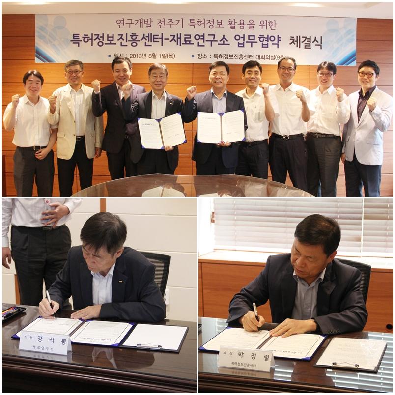 특허정보진흥센터(소장 박정렬)는 재료연구소(소장 강석봉)와 8월 1일 오전 11시 특허정보진흥센터 대회의실에서 특허정보 제공 및 활용을 위한 업무협약을 체결했습니다.