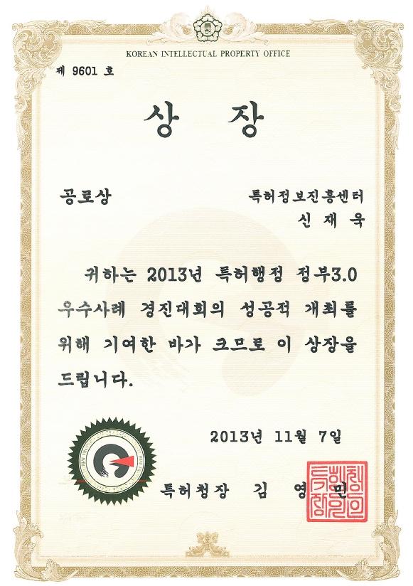 지난 11.7(목) 대전 특허청에서 개최됐던 '특허행정 정부 3.0 우수사례 경진대회'에서 '표준특허의 대중화 및 창출기반 강화'를 주제로 발표했던 표준특허센터 신재욱 팀장이 특허청장 공로상을 수상하였습니다.
