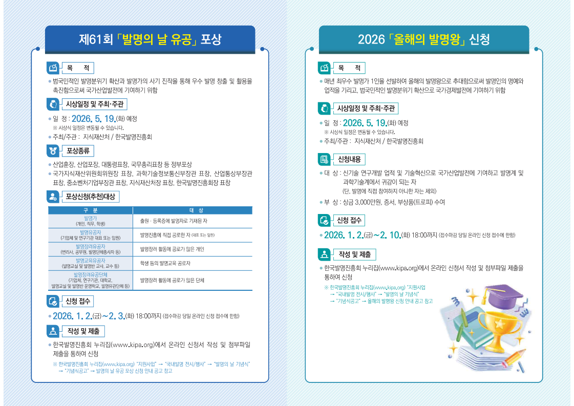 * 올해의 발명왕(상금 3천만원, 발명의 날과 중복신청 가능) 신청의 경우‘26. 2. 10.(화) 18:00까지 접수