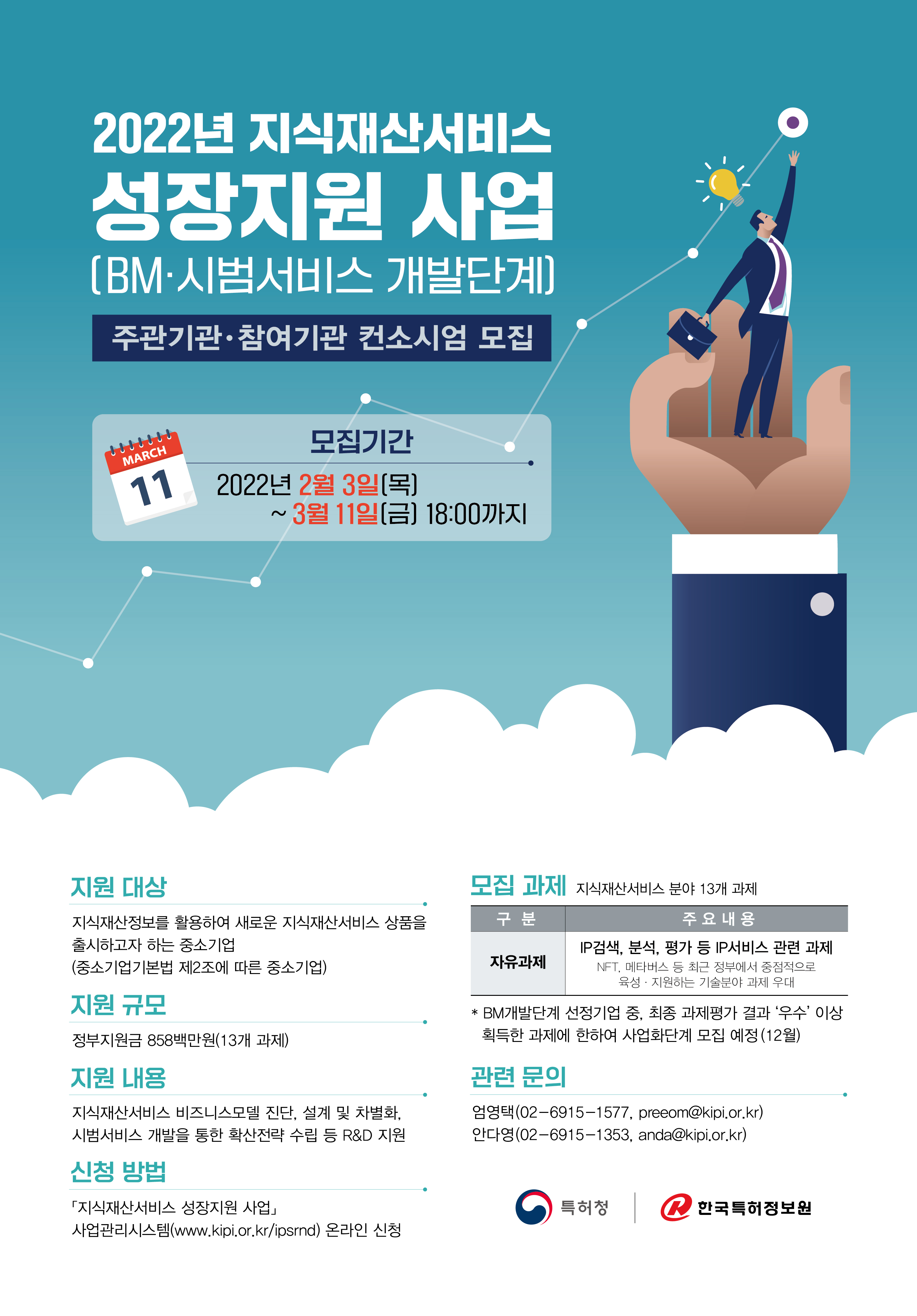 [한국특허정보원]2022년 지식재산서비스 성장지원 사업(BM·시범서비스 개발단계) 주관기관-참여기관 컨소시엄 모집