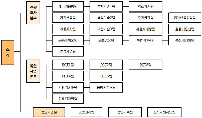 특허정보진흥센터(소장 이동근)는 2016. 2. 5(금), 기존의 2본부 30부서(1실 29팀)의 조직을 2본부 28부서(1실 27팀)로 개편하였습니다.