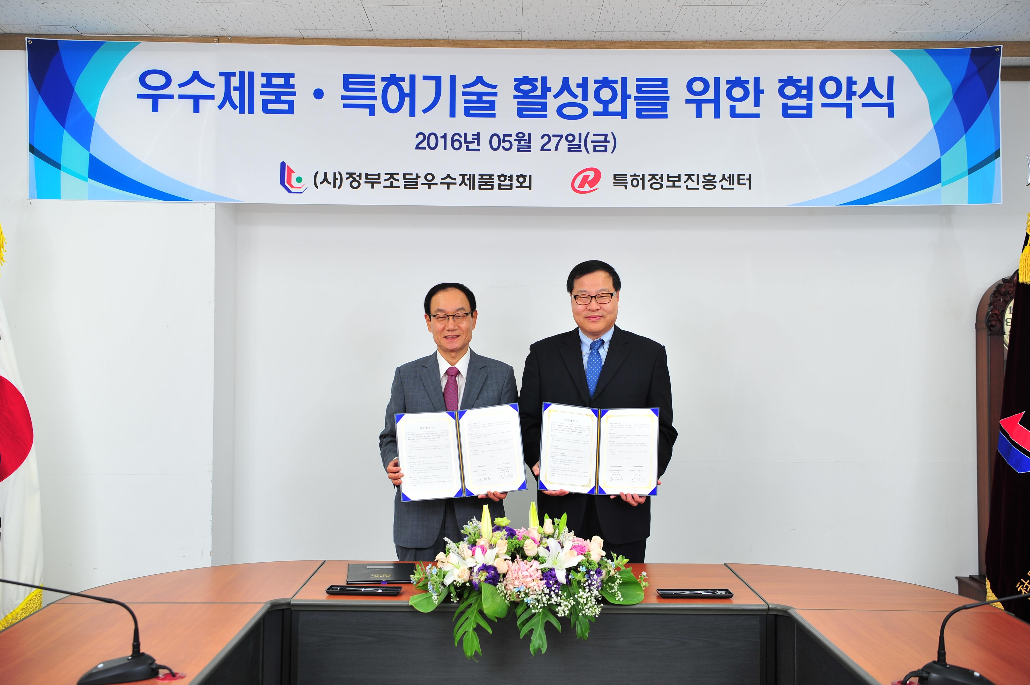 특허정보진흥센터(소장 이동근)는 정부조달우수제품협회(회장 장세용)와 27일 오전 10시 ‘조달우수제품의 특허기술적용 검증 업무 협조 구축’을 위한 업무협약을 체결했습니다.