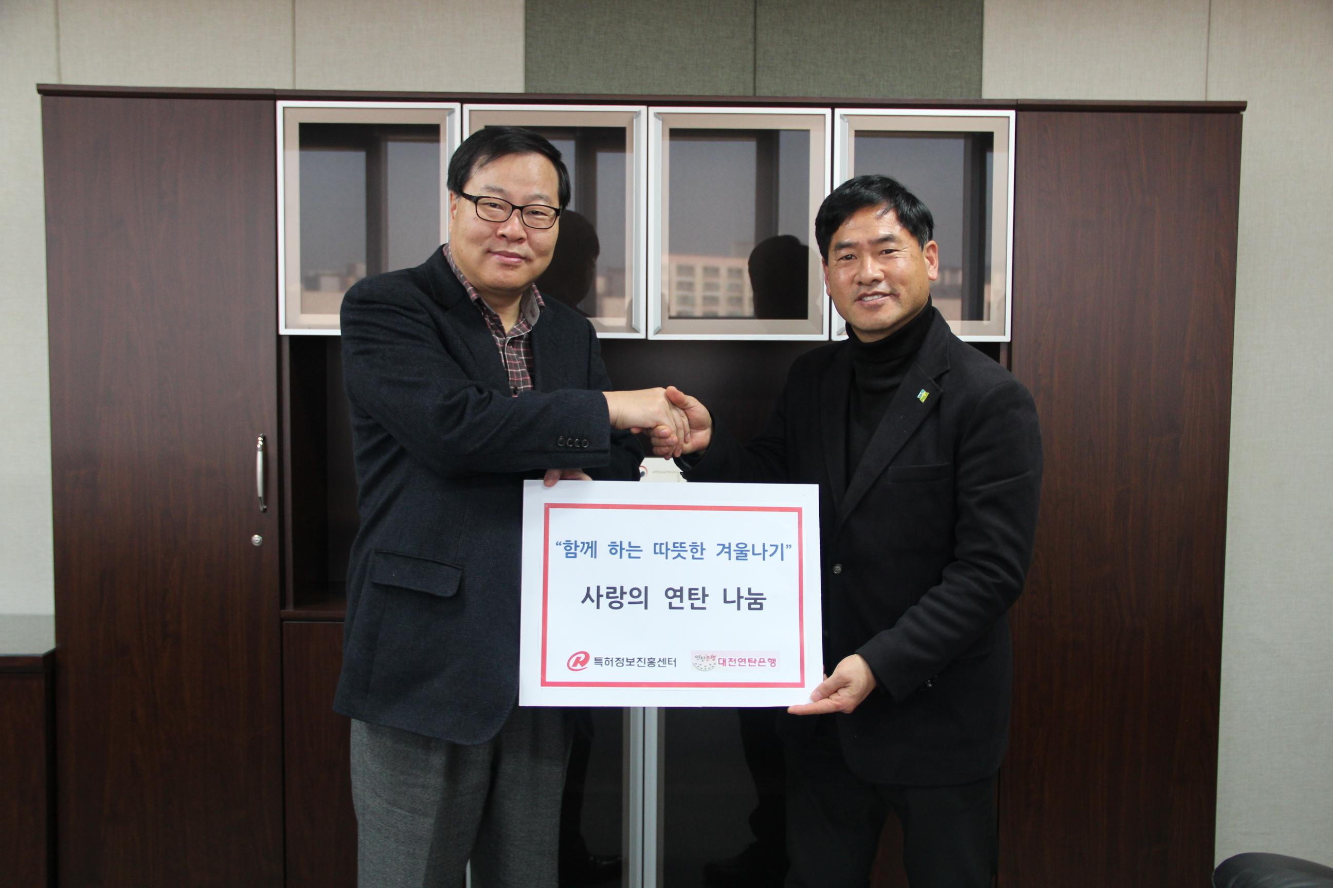 특허정보진흥센터(소장, 이동근)는 오늘(1.25, 수) 오전, 대전연탄은행(신원규 목사)에 어려운 이웃에게 전달할 사랑의 연탄 5,000장을 전달하였습니다.