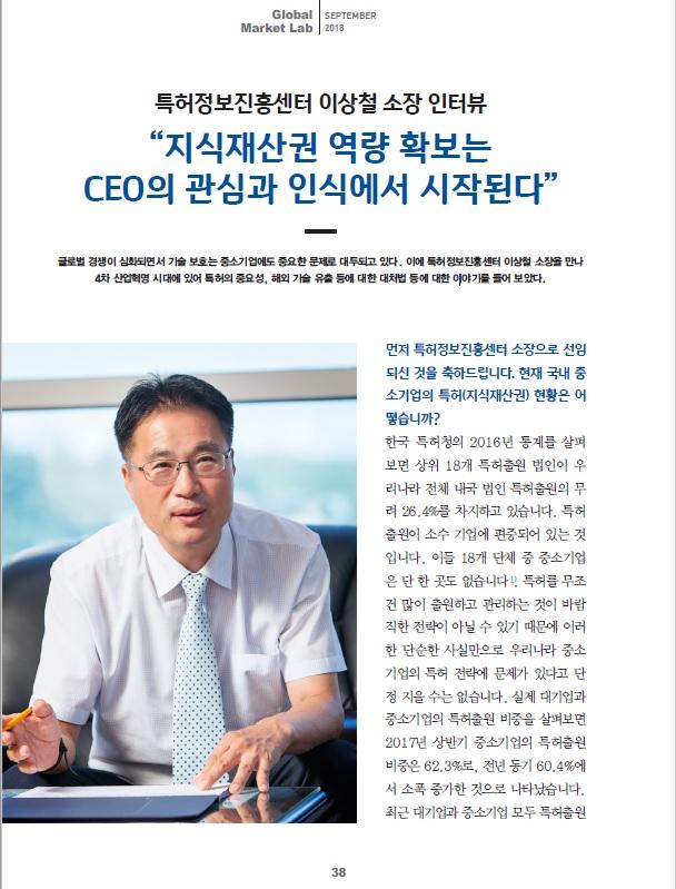 특허정보진흥센터 이상철 소장의 인터뷰 기사가 IBK 경제연구소의 <중소기업 CEO 리포트> 9월호(p.38~41)에 게재되었습니다.