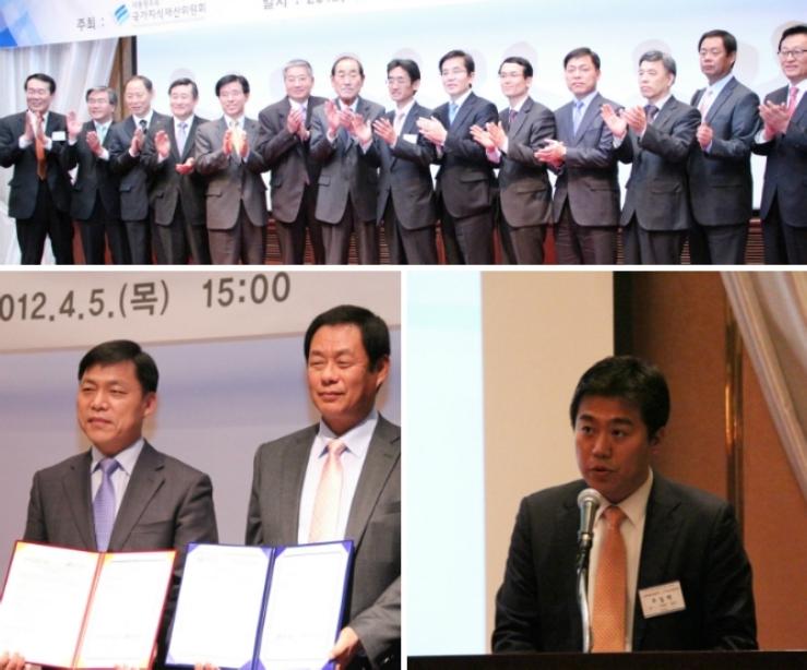 <사진설명//상)윤종용 위원장 비롯하여 이날 MOU를 체결한 기관장들이 기념촬영을 하고 있다. 하좌) 박정렬 소장(PIPC)과 이근협 회장(TTA)이 MOU 체결식 후 기념촬영을 하고 있다. 하우) 주일택 전략사업본부장이 특허정보진흥센터 기관소개 발표를 하고 있다.>