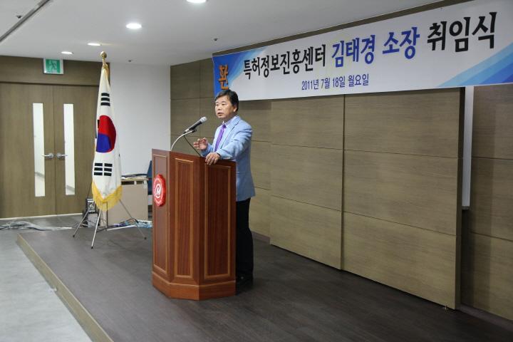 특허정보 진흥센 터 김태경 초대소장이 센터 대회의장에서 임직원이 참석한 가운데, 취임사를 하고 있다. (2011. 7. 18)