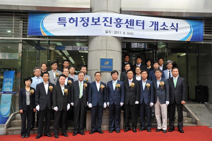 한국특허정보원(원장 박재천, 오른쪽 네번째)은 8월 3일 이수원 특허청장(사진중앙 왼쪽)을 비롯해 정부, 기업, 대학관계자 등이 참석한 가운데 부설기관인 '특허정보진흥센터(소장 김태경, 사진중앙 오른쪽) 개소식' 을 개최했다, (2011. 8. 3)