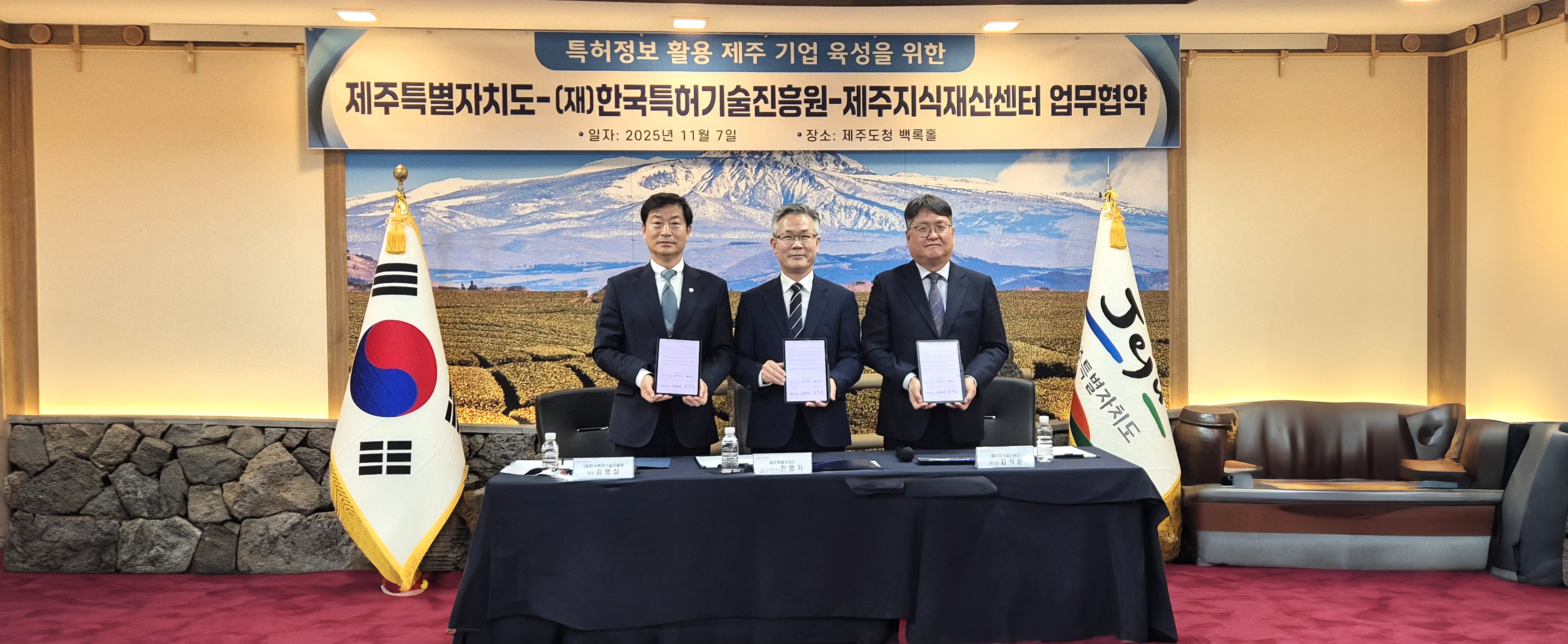 (왼쪽부터 한국특허기술진흥원 김명섭 원장, 진명기 제주도 행정부지사, 김석훈 제주지식재산센터장)