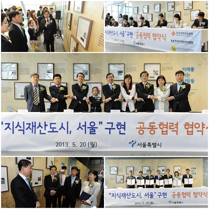 서울시와 특허정보진흥센터를 포함한 6개 지식재산 유관기관*은 20일 오전 10시 30분, 서울시청 신청사 6층 '특허의 벽(미래를 여는 사람들)'에서 '지식재산도시, 서울' 구현을 위한 공동협력 업무협약식을 가졌다.