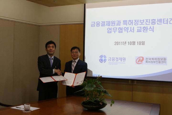 센터 노성열 수석연구원(왼쪽)이 금융결제원과의 상호 업무 협력 강화를 위한 의향서(MOU)를 교환하고 있다. (2011. 10. 10)