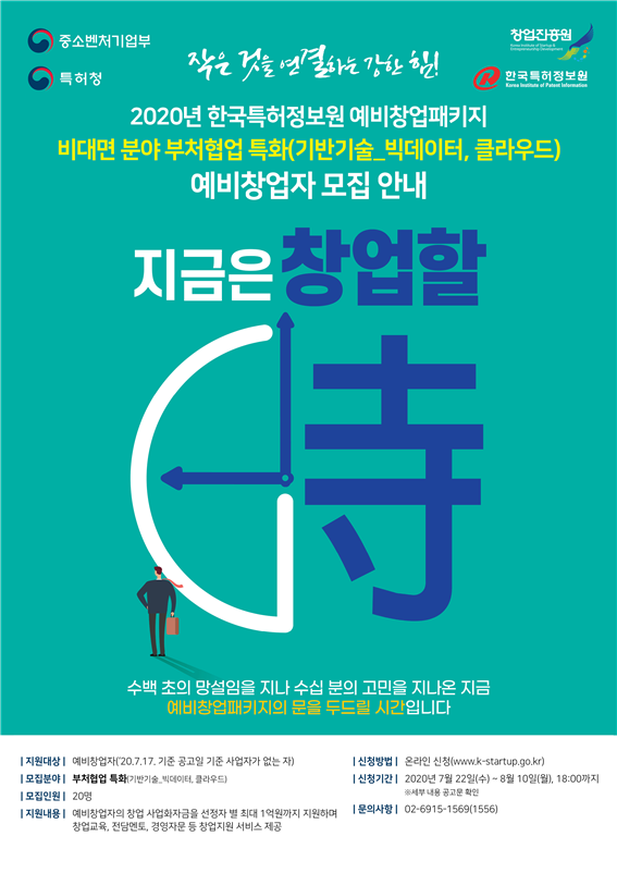 [한국특허정보원] 2020년 한국특허정보원 예비창업패키지 비대면분야 부처협업 특화(기반기술-빅데이터,클라우드) 예비창업자 모집 안내
