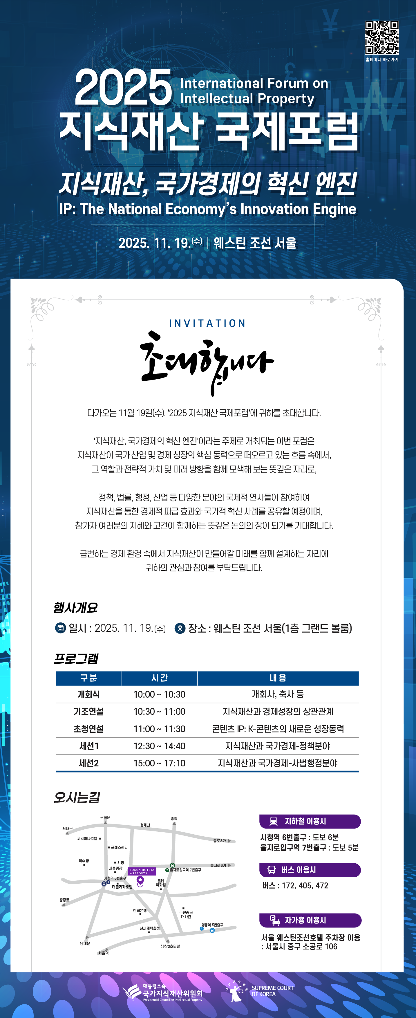 국가지식재산위원회(이하 '위원회')는 지식재산과 국가경제 성장 간의 긴밀한 관계를 살펴보고 향후 역할 및 발전 방향을 모색하고자 아래와 같이 '2025 지식재산 국제포럼'을 개최합니다.